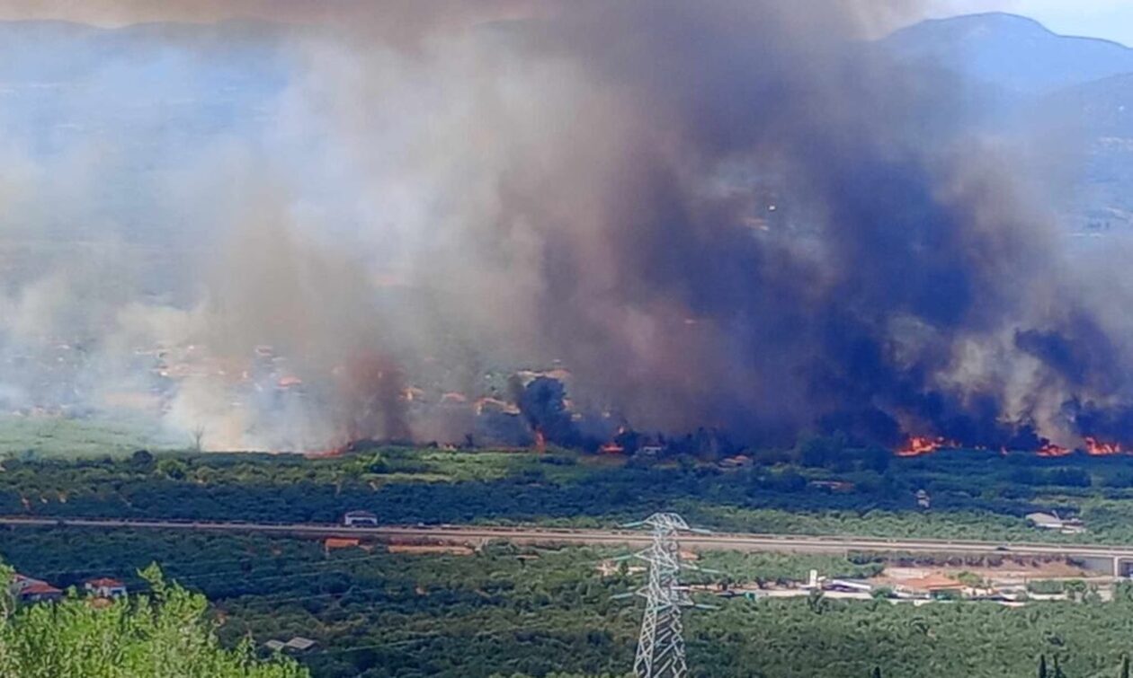 Η πυρκαγιά στην Ασπροπουλιά Καλαμάτας καίει σε καλαμιώνες και χαμηλή βλάστηση.