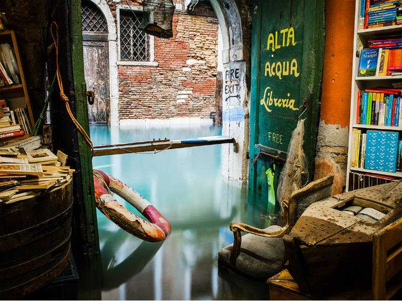 Αυτό το βιβλιοπωλείο το συγκαταλέγουμε σίγουρα στα περίεργα! Κρατώντας μια συλλογή βιβλίων σε μια πόλη όπου οι δρόμοι είναι κατασκευασμένοι από νερό είναι μια επικίνδυνη ιδέα, αλλά η Libreria Acqua Alta στη Βενετία έχει προνοήσει για να μείνουν όλα της τα βιβλία αδιάβροχα!