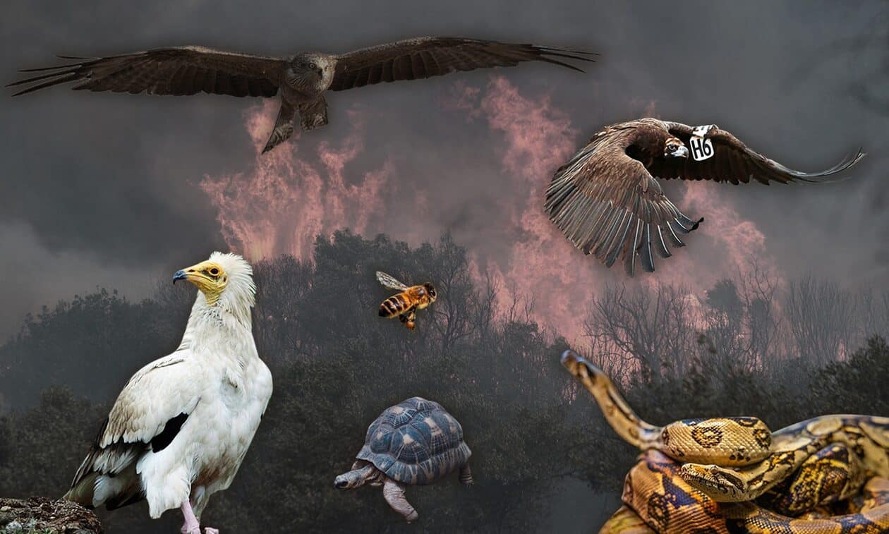 «Υπάρχουν δύο ειδών προβλήματα με την άγρια χλωρίδα και πανίδα. Με τη χλωρίδα, δηλαδή μετά με τα φυτά και τα είδη τους δεν θα υπάρξουν πολύ σοβαρά προβλήματα. Η περιοχή δεν είναι διάσημη για τα φυτά αλλά για τα ζώα. Σε μια τόσο μεγάλη καταστροφική και μεγάλη φωτιά καίγονται πολλά ζώα, αυτό αφορά σχεδόν όλες τις ομάδες ζώων εκτός από τα πουλιά, αλλά και πουλιά τα οποία βρίσκονται σε φωλιές. Μεγάλες απώλειες σημειώνονται σε ζώα που ζουν στο έδαφος μαζί με όλα τα σπονδυλωτά, δηλαδή αμφίβια, ερπετά και θηλαστικά. Υπάρχουν απώλειες σε χελώνες, φίδια, ποντίκια και άλλα ζώα», ανέφερε ο κύριος Κατσαδωράκης.