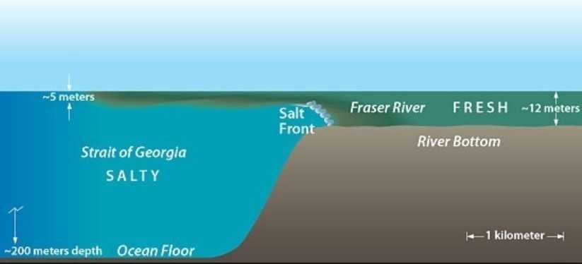 Ωστόσο, η ανάμειξη των νερών συμβαίνει αλλά σε πολύ αργό χρόνο εξαιτίας της διαφοράς στην αλατότητα των νερών και της θερμοκρασίας. Η διαφορά στην πυκνότητα των νερών επιτρέπει να έρχονται κοντά αλλά να μην αναμειγνύονται αμέσως.