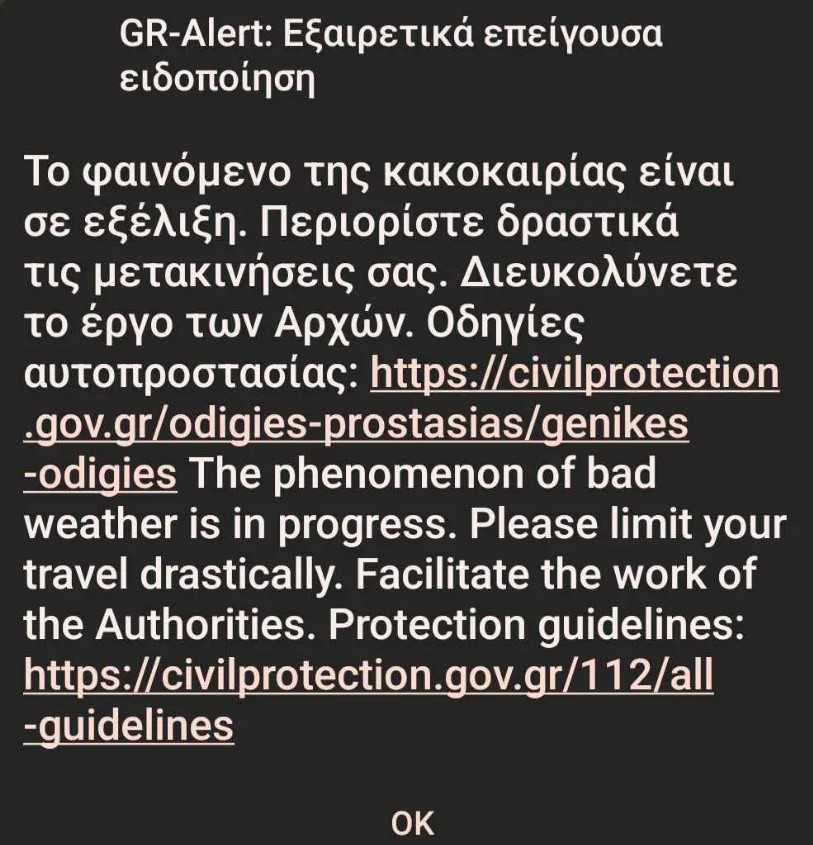 Το 112 ήχησε στις 09:45 στους κατοίκους του Βόλου, της Μαγνησίας και της Θεσσαλονίκης επισημαίνοντας τον αναγκαίο περιορισμό των μετακινήσεων, λόγω του φαινομένου της κακοκαιρίας που βρίσκεται σε πλήρη εξέλιξη.