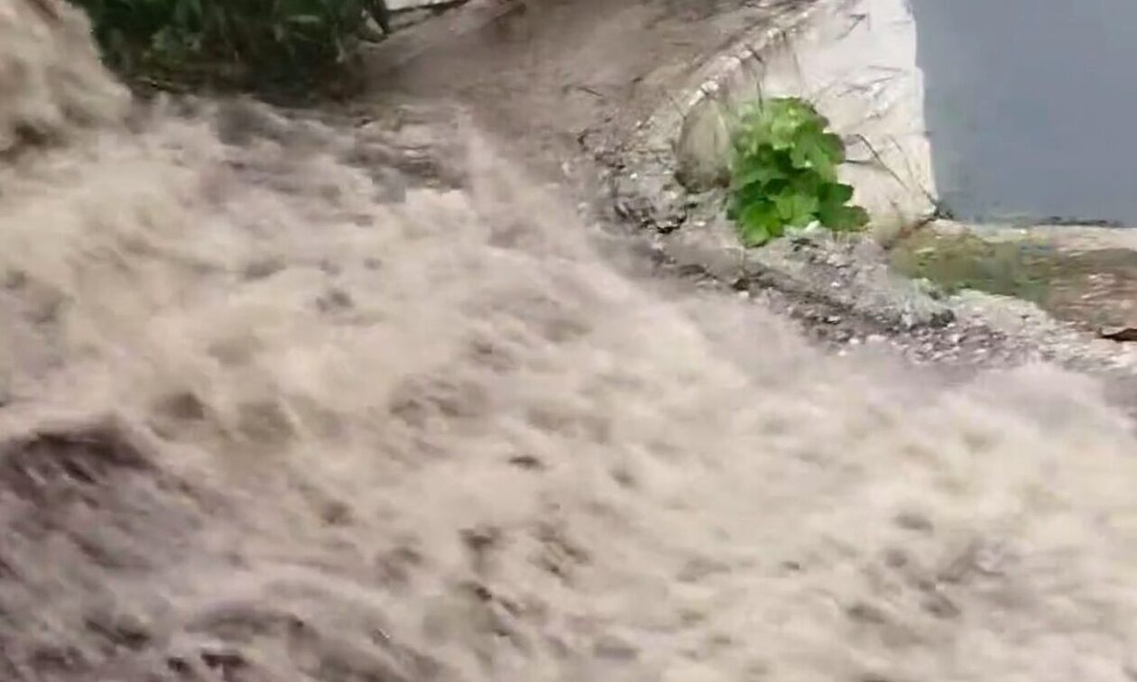 Το ύψος του νερού στον χείμαρρο που βλέπετε συγκεντρώνει νερά από το χωριό, και διασχίζει συνοικίες του με αποτέλεσμα να είναι εγκλωβισμένοι οι κάτοικοι στα σπίτια τους.