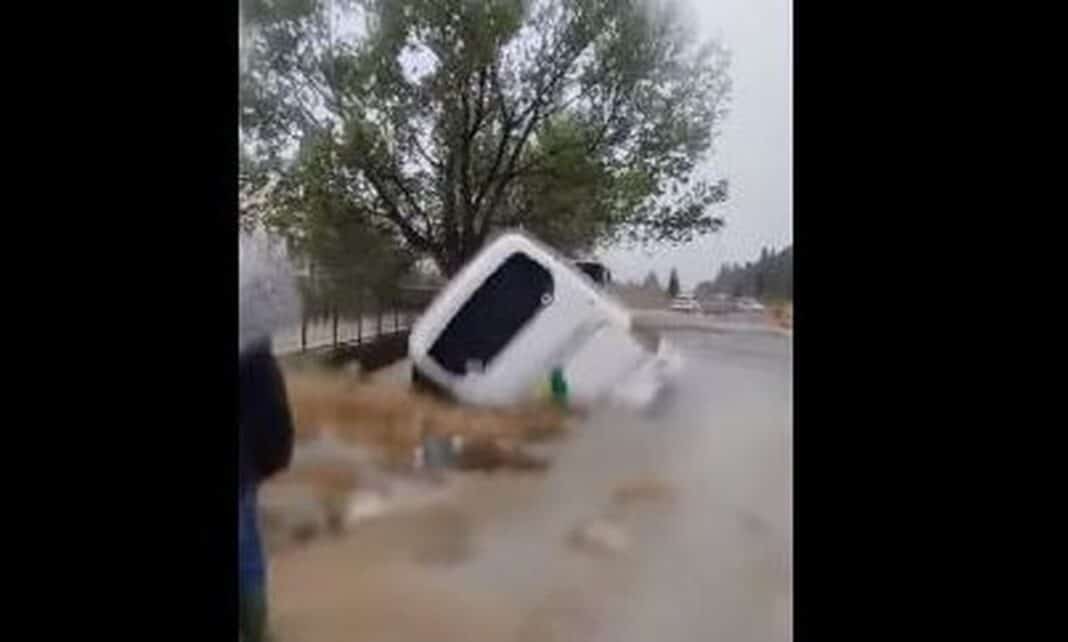 Εξαιτίας των ορμητικών νερών στους παρόχθιους του Κραυσίδωνα το έδαφος υποχώρησε και λεωφορείου το οποίο ήταν σταθμευμένο δίπλα στο πεζοδρόμιο βουλιάξε σχεδόν ολόκληρο.