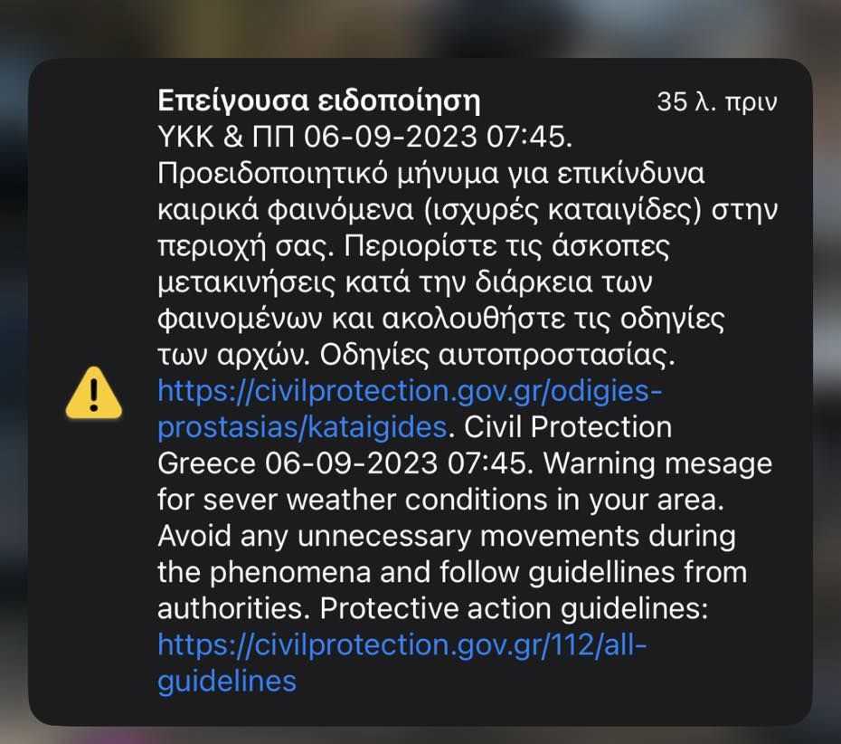 «Ενεργοποίηση 112 σε Μέθανα και Τροιζήνα. Προειδοποιητικό μήνυμα για επικίνδυνα καιρικά φαινόμενα (ισχυρές καταιγίδες) στην περιοχή σας. Περιορίστε τις άσκοπες μετακινήσεις.