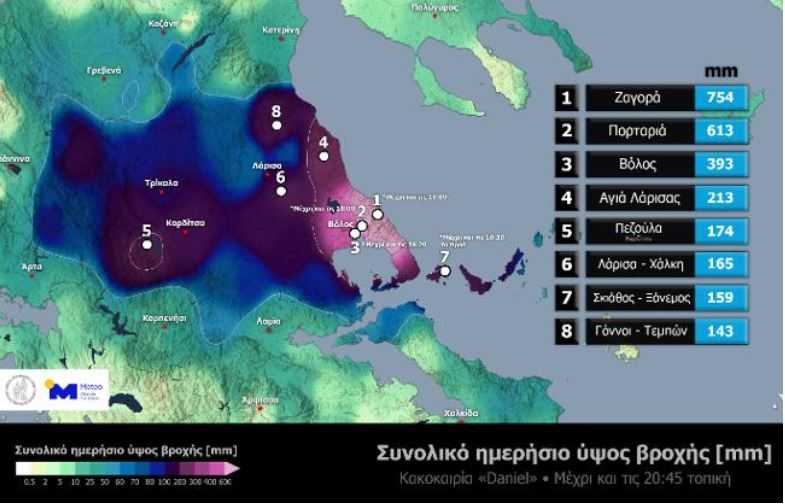Το μεγαλύτερο ημερήσιο ύψος βροχής μέχρι τις 20:45 καταγράφεται στη Ζαγορά Πηλίου και είναι ίσο με 754 mm*.