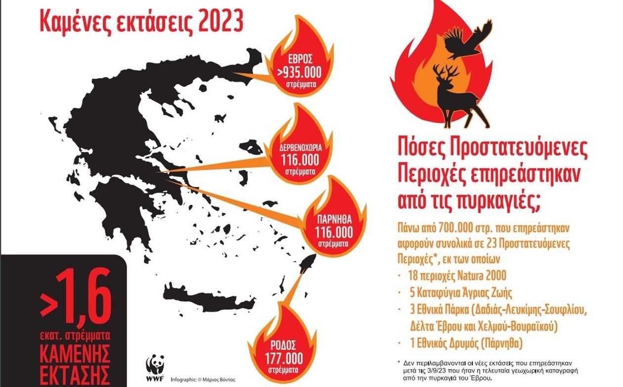Πέραν των χιλιάδων ζώων που κάηκαν, των ανθρώπων που χάθηκαν άδικα και των αμέτρητων περιουσιών που καταστράφηκαν, ο έως τώρα απολογισμός είναι αποκαρδιωτικός και για το φυσικό περιβάλλον. Όπως σημειώνει η πρώτη οικολογική αποτίμηση του WWF, από τις φετινές πυρκαγιές επλήγησαν ιδιαίτερα οι προστατευόμενες περιοχές. Ειδικότερα, μέχρι στιγμής έχουν επηρεαστεί συνολικά πάνω από 700.000 στρέμματα σε 23 Προστατευόμενες Περιοχές (χωρίς να υπολογίζονται οι νέες εκτάσεις που επηρεάστηκαν μετά τις 3 Σεπτεμβρίου που ήταν η τελευταία γεωχωρική καταγραφή από την πυρκαγιά του Έβρου). Αυτές περιλαμβάνουν 18 περιοχές Natura 2000 και 5 Καταφύγια Άγριας Ζωής (ΚΑΖ), ενώ ταυτόχρονα, επηρεάστηκαν 3 σημαντικότατα Εθνικά Πάρκα (Δαδιάς-Λευκίμης-Σουφλίου, Δέλτα Έβρου και Χελμού-Βουραϊκού), καθώς και ο Εθνικός Δρυμός Πάρνηθας.