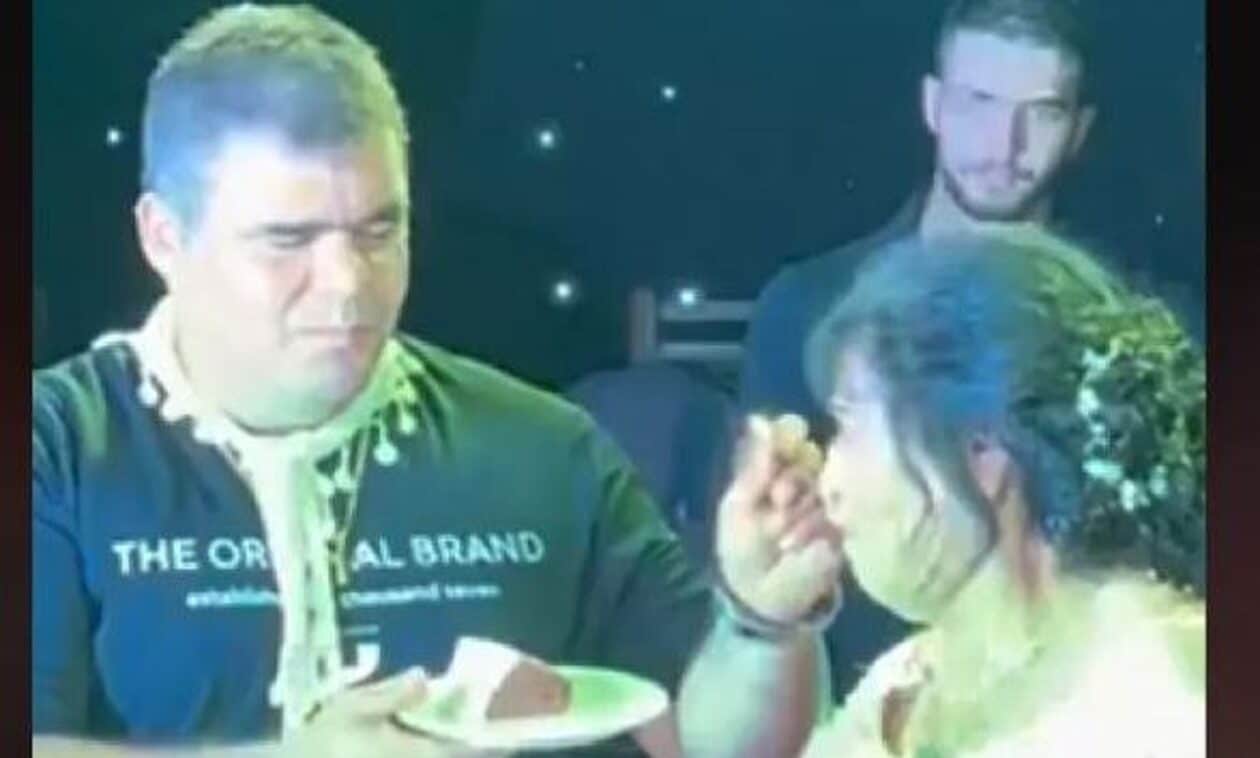 Το ζευγάρι ανέβηκε στην πίστα που ήταν στρωμένο το τραπέζι με την τετραώροφη γαμήλια τούρτα. Τα φλας άστραψαν ο γαμπρός έκοψε την τούρτα και έδωσε την πρώτη κουταλιά στη νύφη και εν συνεχεία έφαγε και εκείνος για να δοθεί το σύνθημα να αρχίσει το γλέντι με τη νύφη να σέρνει το χορό με κρητικά και άλλα.
