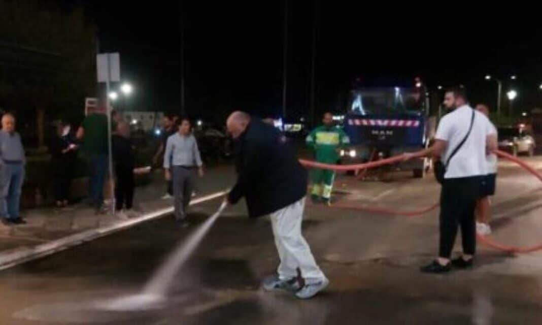 Στις επιχειρήσεις καθαρισμού συμμετείχε και ο Αχιλλέας Μπέος. Ο δήμαρχος της πόλης έπιασε τη μάνικα και έπλυνε το οδόστρωμα, δίνοντας το μήνυμα ότι όλοι πρέπει να συμβάλουν προκειμένου να επιστρέψουν σε μία κανονικότητα.