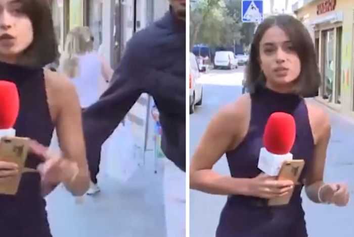 Στο πλάνο, ενώ εκείνη κρατά το μικρόφωνο της και κοιτάζει την κάμερα, εμφανίζεται πίσω της ένας άνδρας, ο οποίος την πλησιάζει και την αγγίζει στους γλουτούς.