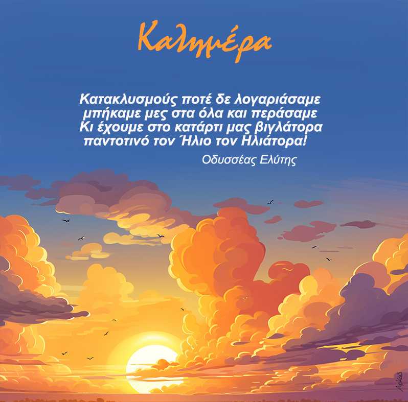 Αρκάς: Ο διάσημος σκιτσογράφος εμπνεύστηκε από τον Ελύτη και δημιούργησε το σημερινό του σκίτσο για να μας πει τη δική του καλημέρα. Όταν όπου γυρίσουμε το μάτι μας βλέπουμε σκοτάδι και εικόνες βιβλικής καταστροφής καθώς άνθρωποι έχασαν τη ζωή τους και εκατοντάδες ζώα είναι νεκρά προσπαθεί να μας περάσει το μήνυμα ότι η ζωή προχωρά.