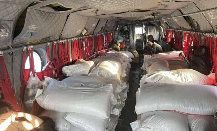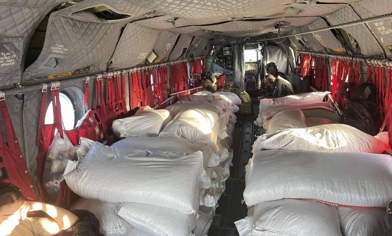 Οι πρώτες αποστολές ζωοτροφών με ελικόπτερα της Πολιτικής Προστασίας έγιναν στο Ομορφοχώρι και στη Νέα Καρυά. Στη συνέχεια μπήκε στον… «χορό» και ο Στρατός με τα Σινούκ, που με συνεχείς αποστολές προμηθεύει με ζωοτροφές περιοχές στις οποίες δεν υπάρχει οδική πρόσβαση.