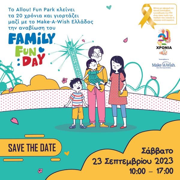 Στις 23 Σεπτεμβρίου, 10:00 – 17:00, χάρη στα 20α γενέθλια του Allou! Fun Park, μικροί και μεγάλοι θα έχουν τη δυνατότητα να παίξουν και να διασκεδάσουν, συμβάλλοντας παράλληλα στην εκπλήρωση ευχών παιδιών με σοβαρές ασθένειες και στην ουσιαστική αποκατάσταση της παιδικότητας τους! Το πάρκο ψυχαγωγίας που όλοι αγαπάμε, θα φιλοξενήσει με αγάπη παιδιά ευχής και οικογένειες δωρεάν, ενώ θα προσφέρει με τη μορφή δωρεάς, 1€ από κάθε πάσο παιχνιδιού που θα αγοραστεί από τους επισκέπτες.