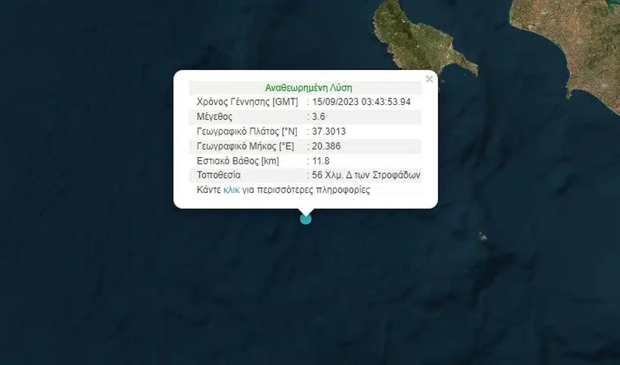 Σύμφωνα με το Γεωδυναμικό Ινστιτούτο, το επίκεντρο του σεισμού εντοπίζεται σε θαλάσσια περιοχή 56 χιλιόμετρα δυτικά των Στροφάδων στη Ζάκυνθο, ενώ το εστιακό βάθος υπολογίζεται στα 11,8 χιλιόμετρα.