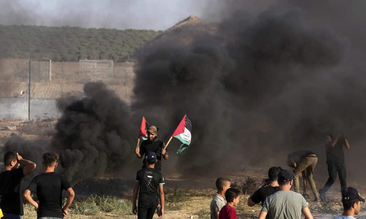 Νωρίτερα, δημοσιογράφος του AFP που ήταν παρών στη διαδήλωση, είδε Παλαιστίνιους να εκτοξεύουν πέτρες και βόμβες μολότοφ στις ισραηλινές δυνάμεις, στην άλλη πλευρά των συνόρων. Δύο διαδηλωτές τραυματίστηκαν από σφαίρες. Πυκνός μαύρος καπνός κάλυψε την περιοχή όταν οι Παλαιστίνιοι έβαλαν φωτιά σε ελαστικά.