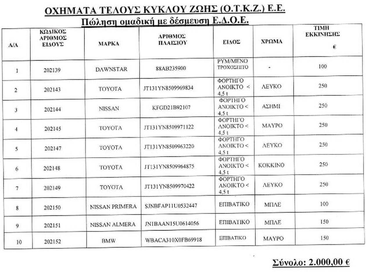 Σήμερα (16/1) στην Ηγουμενίτσα θα δημοπρατηθούν 14 επιβατικά οχήματα, ένα φορτηγό όχημα και 19 οχήματα τέλους κύκλου ζωής (ΟΚΤΖ) με δέσμευση ΕΔΟΕ και έκδοση ΑΕΠΟ κοινοτικής και μη κοινοτικής προέλευσης, τα οποία βρίσκονται στον χώρο φύλαξης οχημάτων του Τελωνείου Ηγουμενίτσας (Λιμάνι Εγνατία).