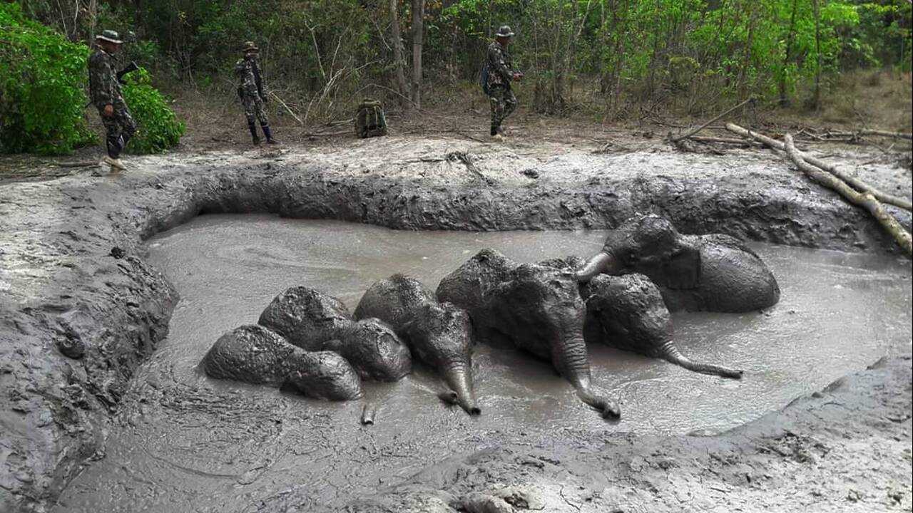 Όταν οι δασοφύλακες συνειδητοποίησαν ότι τα ελεφαντάκια, ηλικίας ενός ως τεσσάρων ετών, δεν μπορούσαν να βγουν από το βαθύ αυτό κοίλωμα με τη λάσπη, ορισμένοι από αυτούς έφυγαν από το δάσος για να φέρουν εργαλεία με τα οποία θα μπορούσαν να τα βοηθήσουν να βγουν, ενώ άλλοι έμειναν όλη τη νύχτα στο πλάι των φοβισμένων παχύδερμων.