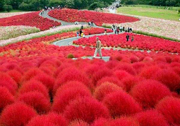 Μία φορά το χρόνο, όμως, το Hitachi Seaside Park «μεταμορφώνεται», αποκαλύπτοντας αυτό που πραγματικά είναι: ένας «μυστικός κήπος» με πανοραμική θέα στον Ειρηνικό Ωκεανό, όπου το απέραντο γαλάζιο προσεγγίζει το ατελείωτο ροζ, φούξια, πορτοκαλί και κίτρινο του φυτού Kochia.