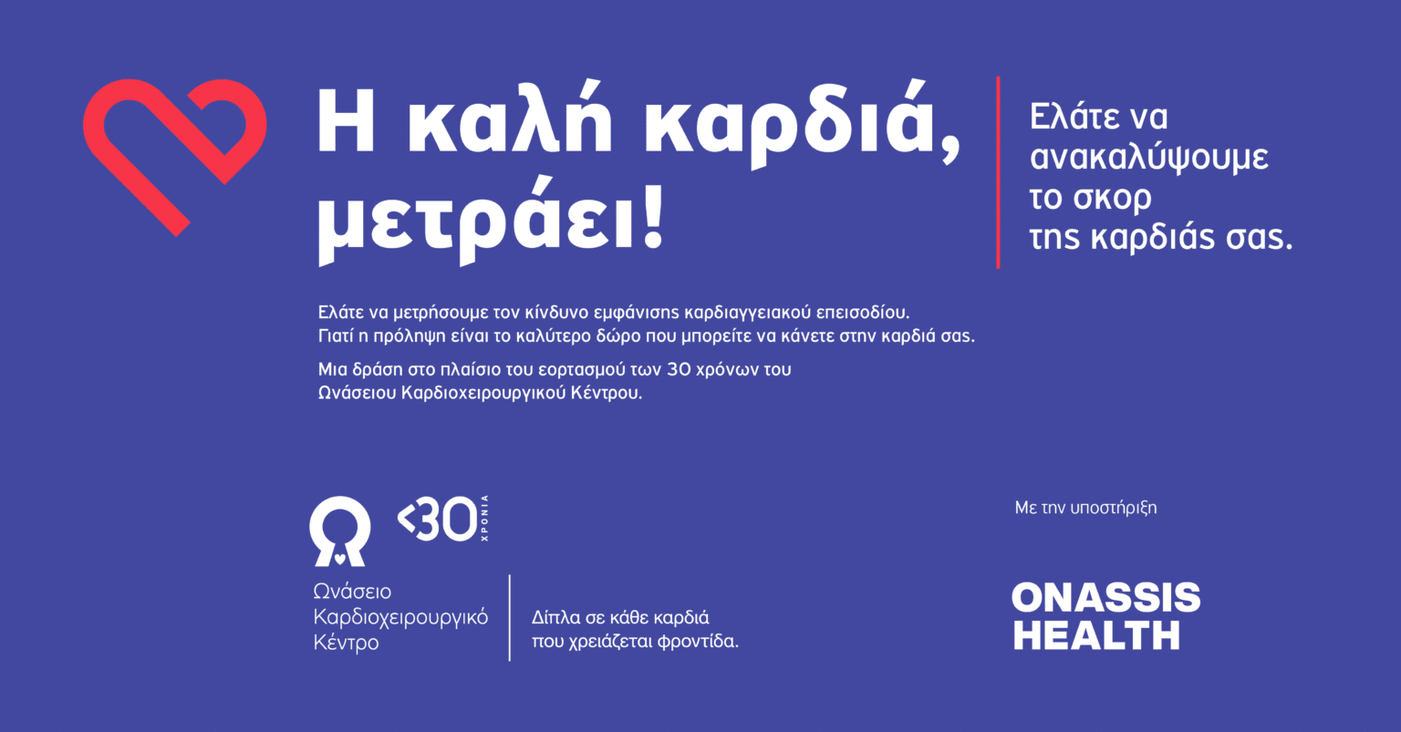 Γι’ αυτό το Ωνάσειο Καρδιοχειρουργικό Κέντρο, στο πλαίσιο των δράσεων εορτασμού των 30 χρόνων λειτουργίας του και προσφοράς στους Έλληνες ασθενείς, διοργανώνει μια δράση ενημέρωσης και ευαισθητοποίησης με την ονομασία “Heartscore – Η καλή καρδιά μετράει”, γιατί ο έλεγχος είναι ο πλέον σημαντικός τρόπος πρόληψης.