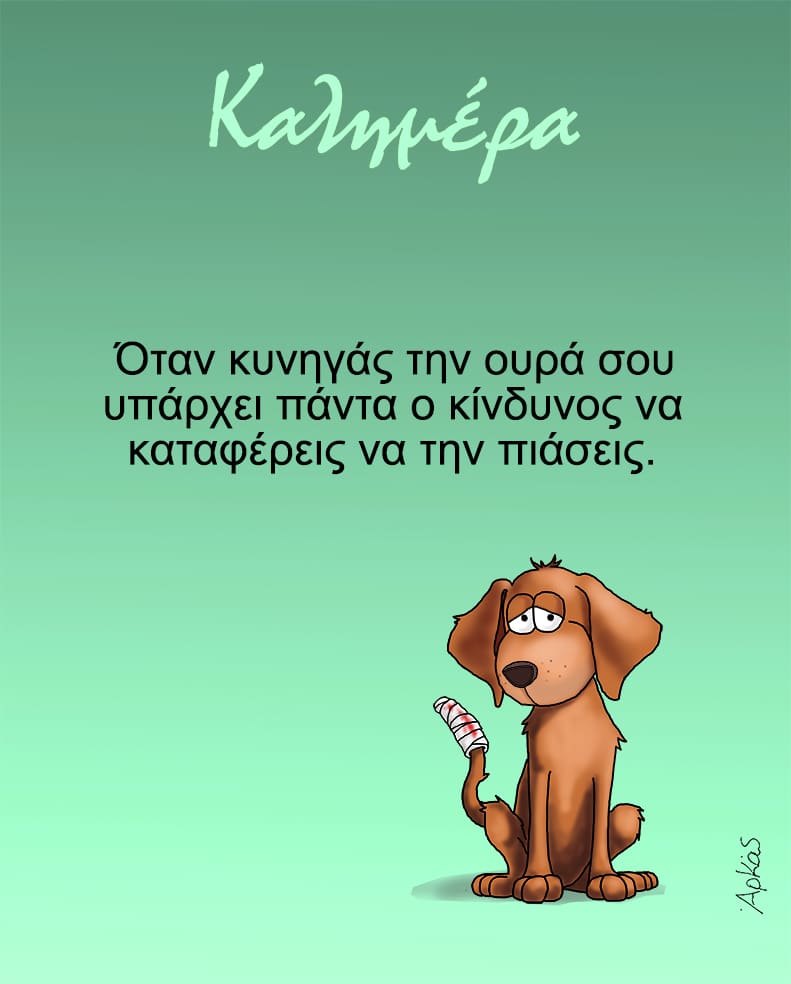 Αρκάς: Με ένα νέο σκίτσο μας λέει τη δική του καλημέρα ο διάσημος σκιτσογράφος. Στο εν λόγω σκίτσο βλέπουμε έναν σκύλο με πληγωμένη ουρά ενώ τη συνοδεύει η λεζάντα «Όταν κυνηγάς την ουρά σου υπάρχει πάντα ο κίνδυνος να καταφέρεις να την πιάσεις».