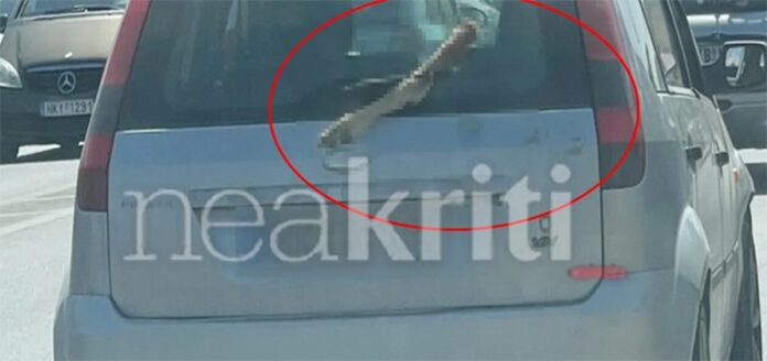 Κι αυτό γιατί, όπως αναφέρει το neakriti.gr, στο πίσω παρμπρίζ του αυτοκινήτου κάποιος είχε τοποθετήσει ένα μέλος ζώου και συγκεκριμένα το πόδι μιας “άμοιρης” κατσίκας. Μάλιστα το είχε«μαγκώσει» με τον υαλοκαθαριστήρα για να μην πέσει στο οδόστρωμα.