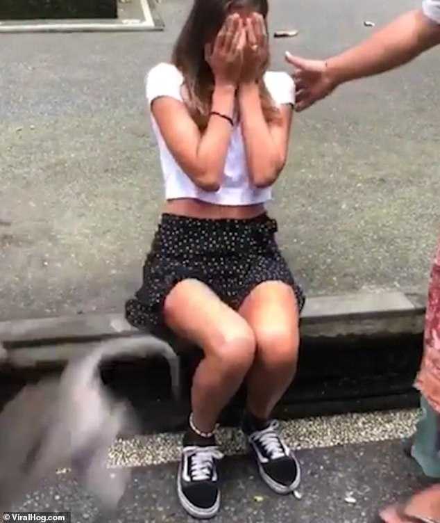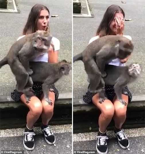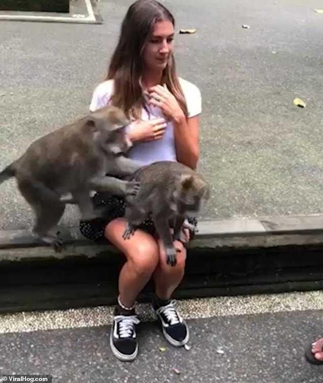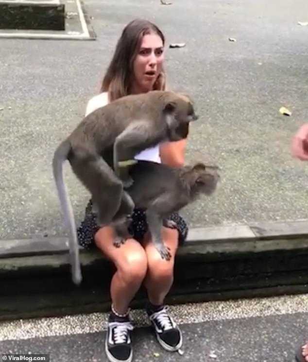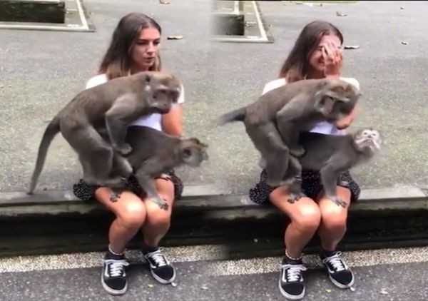 Η τουρίστρια βρισκόταν στο πάρκο Sangeh Monkey Forest στο Μπαλί στην Ινδονησία όταν μια γκρι θηλυκή μαϊμού πήδηξε πάνω στα γόνατά της.