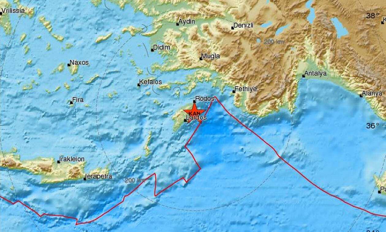 Το ακριβές επίκεντρο της δόνησης εντοπίζεται, 25χλμ. νότια της Ρόδου.