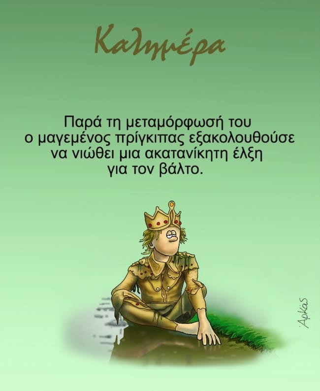 Αρκάς: Με ένα νέο σκίτσο μας λέει τη δική του καλημέρα ο διάσημος σκιτσογράφος. Συγκεκριμένα, στη σημερινή του ανάρτηση βλέπουμε έναν… μεταμορφωμένο πρίγκιπα, ενώ η λεζάντα γράφει: “Παρά τη μεταμόρφωσή του, ο μαγεμένος πρίγκιπας εξακολουθούσε να νιώθει μια ακατανίκητη έλξη για τον βάλτο”.
