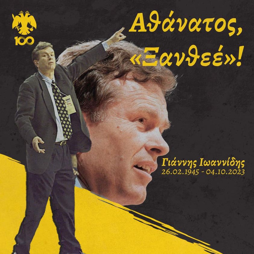 Η ΚΑΕ Άρης για τον Γιάννη Ιωαννίδη: «Πού πας, «Ξανθέ»; Εσύ που έκανες τον ΑΡΗ Αυτοκράτορα;… Ο Θεός να αναπαύσει την ψυχή σου, μέγιστε. Η «Dream Team» ΑΡΗ Παραδείσου βρήκε τον ιδανικό κόουτς. Κι εκεί, «γκάζια» θα τους βάζεις… Γιατί η νίκη ήταν, είναι και θα είναι συνώνυμό σου…»