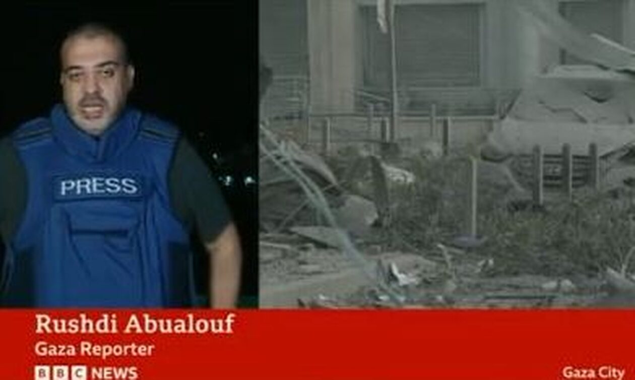 Η ζωντανή μετάδοση του δημοσιογράφου του BBC Rushdi Abu Alouf στο BBC από τη Γάζα διεκόπη όταν ακούστηκε μια δυνατή έκρηξη.