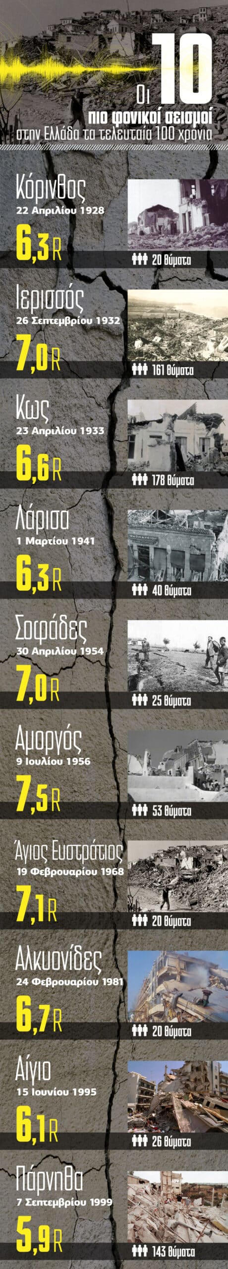 Θεωρούνται οι καταστροφικότεροι σεισμοί στην ιστορία της νεότερης Ελλάδας, και είναι εκτός – κακώς εννοούμενου – συναγωνισμού από την παρακάτω λίστα με 10 από τους πιο φονικούς σεισμούς στην Ελλάδα τα τελευταία 100 χρόνια.
