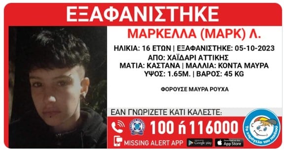 Εξαφανίστηκε από την περιοχή του Χαϊδαρίου, μεσημεριανές ώρες της Πέμπτης 5 Οκτωβρίου, η Μαρκέλλα (Μάρκ) Λ. 16 ετών.