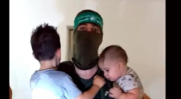 Μέλη της Χαμάς κρατούν μικρά παιδιά και μωρά στο κιμπούτς Χολίτ στο νότιο Ισραήλ το περασμένο Σαββατοκύριακο, σε μια προφανή προσπάθεια η Χαμάς να υποβαθμίσει τον αντίκτυπο της αιματοχυσίας όπως αναφέρει το skai.gr
