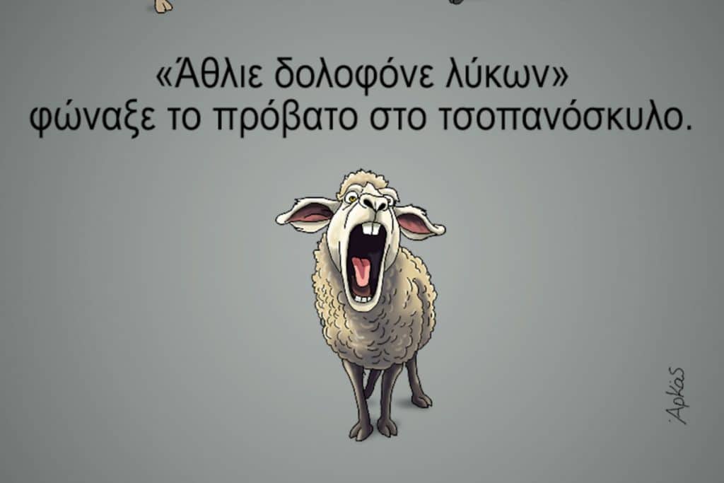 Ο Αρκάς με το καυστικό χιούμορ που τον διακατέχει στο σημερινό σκίτσο του βάζει ένα πρόβατο να κατηγορεί τον προστάτη που πάει να τον σώσει από τους…κακούς τους λύκους.
