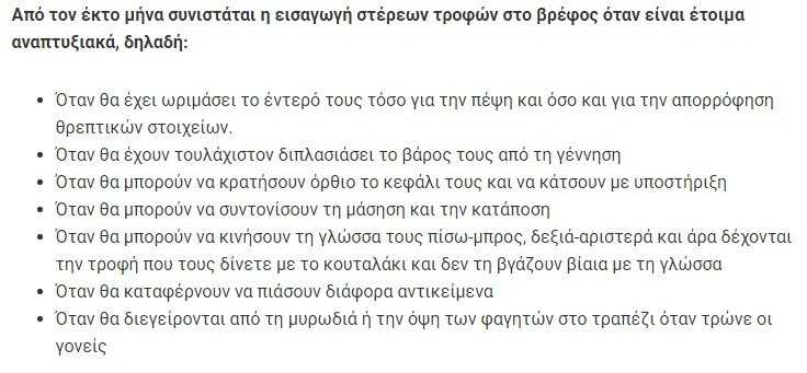 Σε κάθε περίπτωση ο παιδίατρός θα αξιολογήσει την πρόοδο και τις ανάγκες του μωρού σας και θα καθορίσει τον χρόνο εισαγωγής στερεάς τροφής κατά περίπτωση.