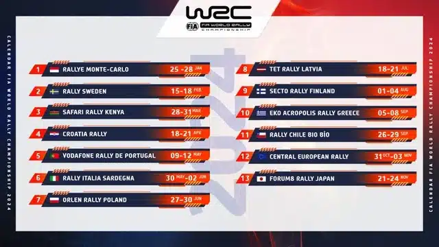 Ο θεσμός στη συνέχεια θα βρεθεί στη Νότια Αμερική για το Ράλλυ Χιλής, ενώ για δεύτερη χρονιά στο ημερολόγιο έχει συμπεριληφθεί το Ράλλυ Κεντρικής Ευρώπης με ειδικές διαδρομές στην Αυστρία, στην Τσεχία και στη Γερμανία. Το φινάλε του Παγκόσμιου Πρωταθλήματος Ράλλυ της FIA και για το 2024 θα «παιχτεί» στην Ασία, με το Ράλλυ Ιαπωνίας.