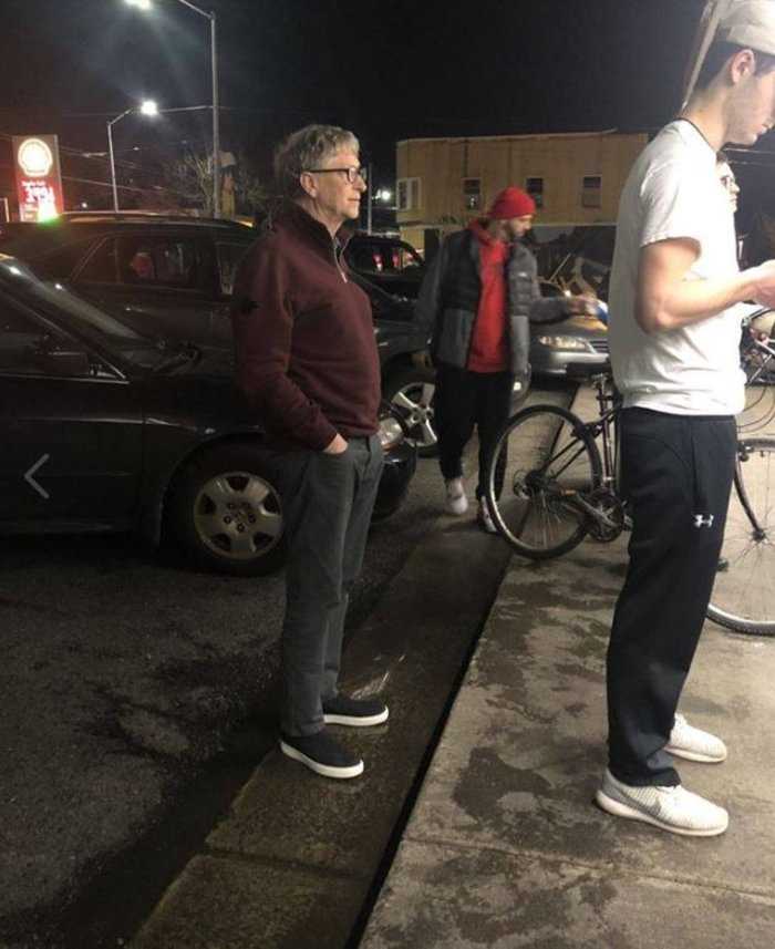 O Μπιλ Γκέιτς περιμένει στην ουρά μπεργκεράδικου στο Σιάτλ για να αγοράσει χάμπουργκερ και αναψυκτικό. H φωτογραφία που δημοσίευσε στο facebook πρώην εργαζόμενος της Microsoft έχει γίνει viral. Με περιουσία που ξεπερνά τα 95,5 δισ. δολάρια, ο 63χρονος Γκέιτς ντυμένος κάζουαλ περίμενε υπομονετικά στο κρύο με τα χέρια στην τσέπες, μέχρι να έρθει η σειρά του. Ο Mike Galos σχολιάζει στην ανάρτησή του: «Όταν έχεις σχεδόν 100 δισ., διευθύνεις τον μεγαλύτερο φιλανθρωπικό οργανισμό στον κόσμο αλλά στέκεσαι στην ουρά για ένα μπέργκερ, πατάτες και αναψυκτικό σαν όλους εμάς… Έτσι φέρονται οι πραγματικοί πλούσιοι άνθρωποι, σε αντίθεση με τον φιγουρατζή με το χρυσό κάλυμμα τουαλέτας στον Λευκό Οίκο».