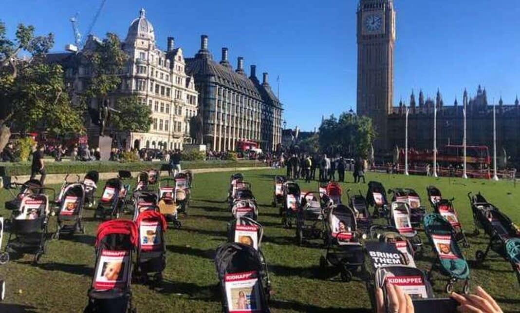 Οι διαδηλωτές αφήνουν άδεια καρότσια στην πλατεία του Κοινοβουλίου στο Λονδίνο σε μία έκκληση για την επιστροφή των Ισραηλινών ομήρων που κρατούνται από τη Χαμάς στη Λωρίδα της Γάζας.