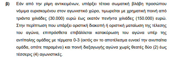 Σημειώνεται πως σύμφωνα με τον πειθαρχικό κώδικα 15,3 για την ρίψη αντικειμένων, εάν η σωματική βλάβη παίκτη η προπονητή προκληθεί από ρίψη αντικειμένων τότε η υπαίτια ομάδα κινδυνεύει με βαρύ χρηματικό πρόστιμο. Εάν ο αγώνας διακοπεί οριστικά, το ματς κατακυρώνεται υπέρ της αντίπαλης ομάδας (0-3) με κίνδυνο έδρας 2 έως 4 αγωνιστικών για την υπαίτια ομάδα