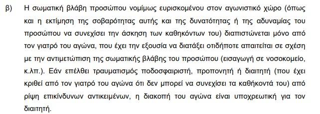 Σύμφωνα με τον Πειθαρχικό Κώδικα της ΕΠΟ σε περίπτωση τραυματισμού ποδοσφαιριστή που δεν μπορεί να συνεχίσει, είναι υποχρεωτική η διακοπή.
