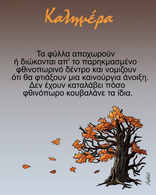 Στο σκίτσο βλέπουμε ένα δέντρο, ενώ η λεζάντα γράφει: «Τα φύλλα αποχωρούν ή διώκονται από το παρηκμασμένο φθινοπωρινό δέντρο και νομίζουν ότι θα φτιάξουν μια καινούρια άνοιξη. Δεν έχουν καταλάβει πόσο φθινόπωρο κουβαλάνε τα ίδια».