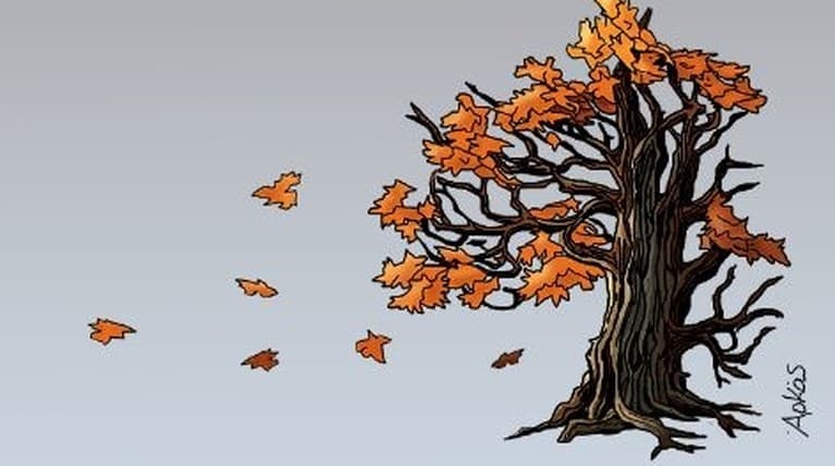 Στο σκίτσο βλέπουμε ένα δέντρο, ενώ η λεζάντα γράφει: «Τα φύλλα αποχωρούν ή διώκονται από το παρηκμασμένο φθινοπωρινό δέντρο και νομίζουν ότι θα φτιάξουν μια καινούρια άνοιξη. Δεν έχουν καταλάβει πόσο φθινόπωρο κουβαλάνε τα ίδια».