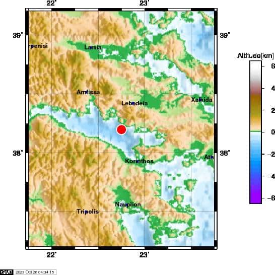 Το ακριβές επίκεντρο τη δόνησης εντοπίζεται στα 22 χλμ. βόρεια του Κιάτου και στα 84 χλμ. δυτικά του Πειραιά.