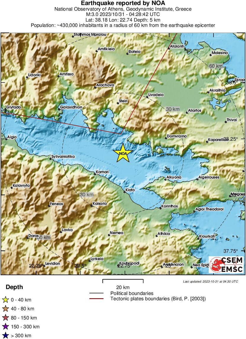 Το εστιακό βάθος του σεισμού, σύμφωνα με την πρώτη εκτίμηση του EMSC, υπολογίζεται στα 5 χλμ.