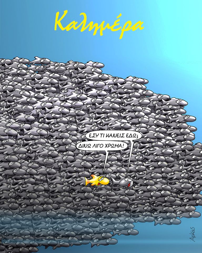 Αρκάς: Ο διάσημος σκιτσογράφος σήμερα μας καλημερίζει με ένα σκίτσο με ψαράκια. Πραγματικά είναι αινιγματικό καθώς δεν κάνει σαφές αν στο μυαλό του κατά την ώρα της σχεδίασής του είχε στο μυαλό του τις εξελίξεις στους κόλπους του ΣΥΡΙΖΑ ή το δράμα των Παλαιστινίων.