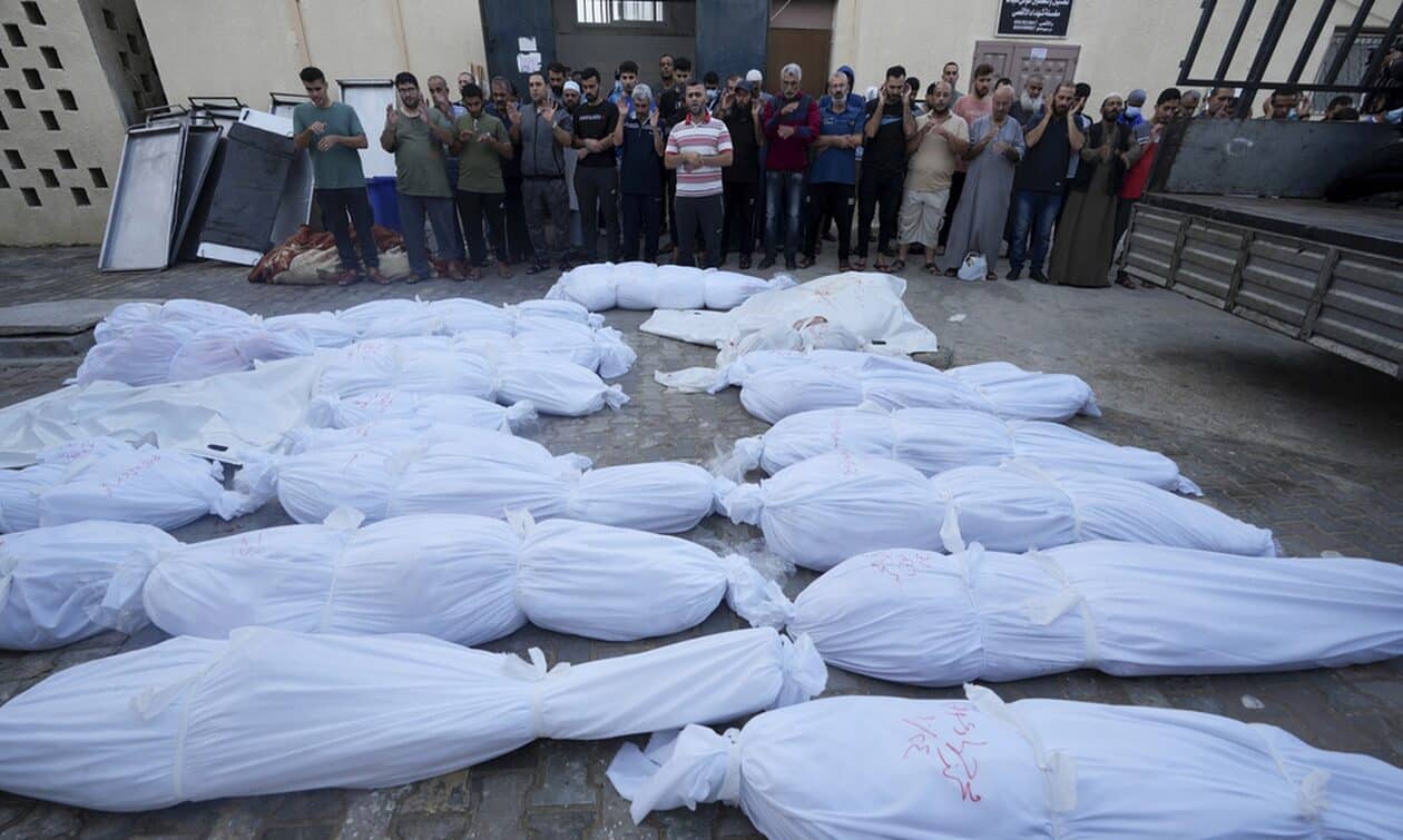Δεκάδες πτώματα τυλιγμένα με λευκά σεντόνια κείτονταν σήμερα στο έδαφος, στον περίβολο του Ινδονησιακού Νοσοκομείου στη Λωρίδα της Γάζας — θύματα ισραηλινής αεροπορικής επιδρομής σε προσφυγικό καταυλισμό, σύμφωνα με τις υγειονομικές αρχές του παλαιστινιακού θύλακα που διοικείται από τη Χαμάς.
