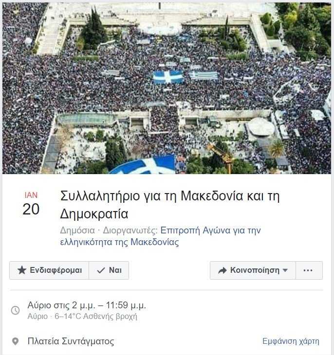 Χαιρετισμό θα απευθύνει, μεταξύ άλλων, ο πρόεδρος της ΚΕΔΕ και υποψήφιος περιφερειάρχης Αττικής Γιωργος Πατούλης και η ερμηνεύτρια Αφροδίτη Μάνου η οποία μάλιστα μέσω του προσωπικού της λογαριασμού στο Facebook ενημερώνει πως μια πλειάδα από καλλιτέχνες ζητούν δημοψήφισμα για την Συμφωνία των Πρεσπών.