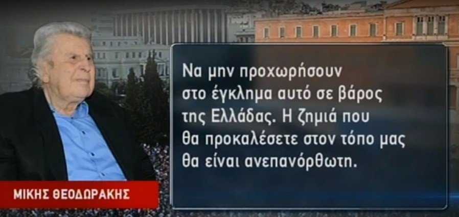 Δεν θα παρευρεθεί ο Μίκης Θεοδωράκης αλλά αναμένεται να διαβαστεί μήνυμά του. Νωρίτερα, δημοσιοποιήθηκε η επιστολή του κ Θεοδωράκη προς τους βουλευτές στην οποία ζητεί δημοψήφισμα για τη συμφωνία.