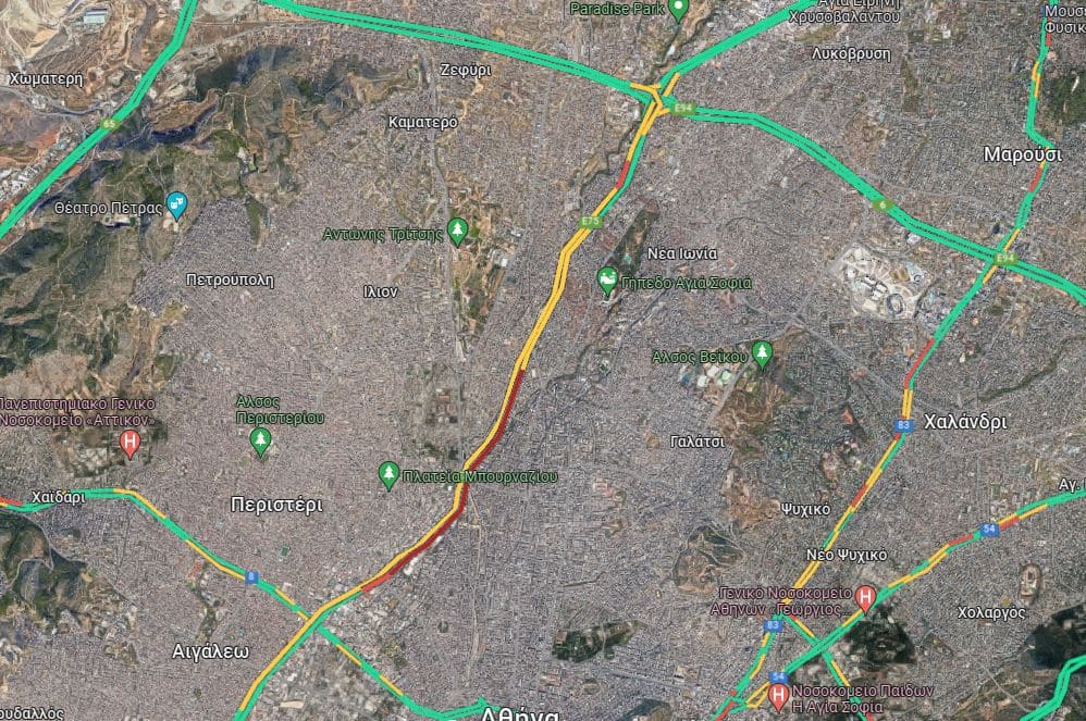 Την ίδια ώρα δύσκολα είναι τα πράγματα και στην κάθοδο με την κίνηση να ξεκινά από το ύψος της Μεταμόρφωσης και να φτάνει μέχρι την έξοδο για Αιγάλεω.