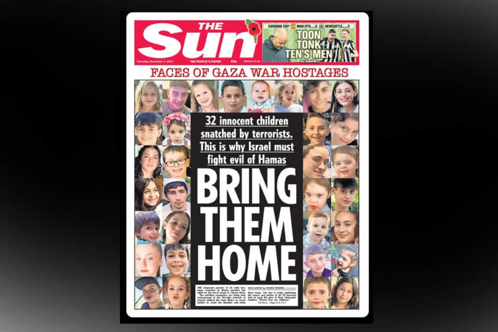 Με ένα πρωτοσέλιδο με τις φωτογραφίες των παιδιών που έχουν απαχθεί από την τρομοκρατική οργάνωση της Χαμάς από τις 7 Οκτωβρίου κυκλοφορεί σήμερα στο Ηνωμένο Βασίλειο η γνωστή εφημερίδα «The Sun.