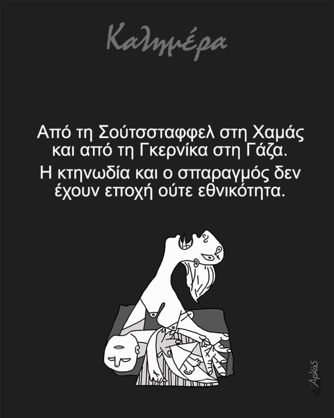 Η λεζάντα του σκίτσου γράφει: “Από τη Σούτσσταφελ στη Χαμάς και από τη Γκέρνικα στη Γάζα. Η κτηνωδία και ο σπαραγμός δεν έχουν ούτε εποχή ούτε εθνικότητα”.